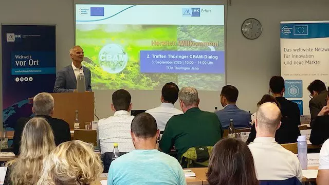 Am 03. September 2025 fand im Servicecenter Ostthüringen des TÜV Thüringen e.V. die Präsenzveranstaltung des Thüringer CBAM-Dialogs statt. Rund 30 mittelständische Unternehmen aus verschiedenen Bereichen der Zulieferindustrie nutzten die Gelegenheit zum Austausch in diesem Interessenkreis, der sich als Plattform zur Information und Diskussion über die aktuellen Anforderungen des CO₂-Grenzausgleichsmechanismus versteht. Organisiert wurde die Veranstaltung von der IHK Erfurt gemeinsam mit der Verifizierungsstelle des TÜV Thüringen e.V..