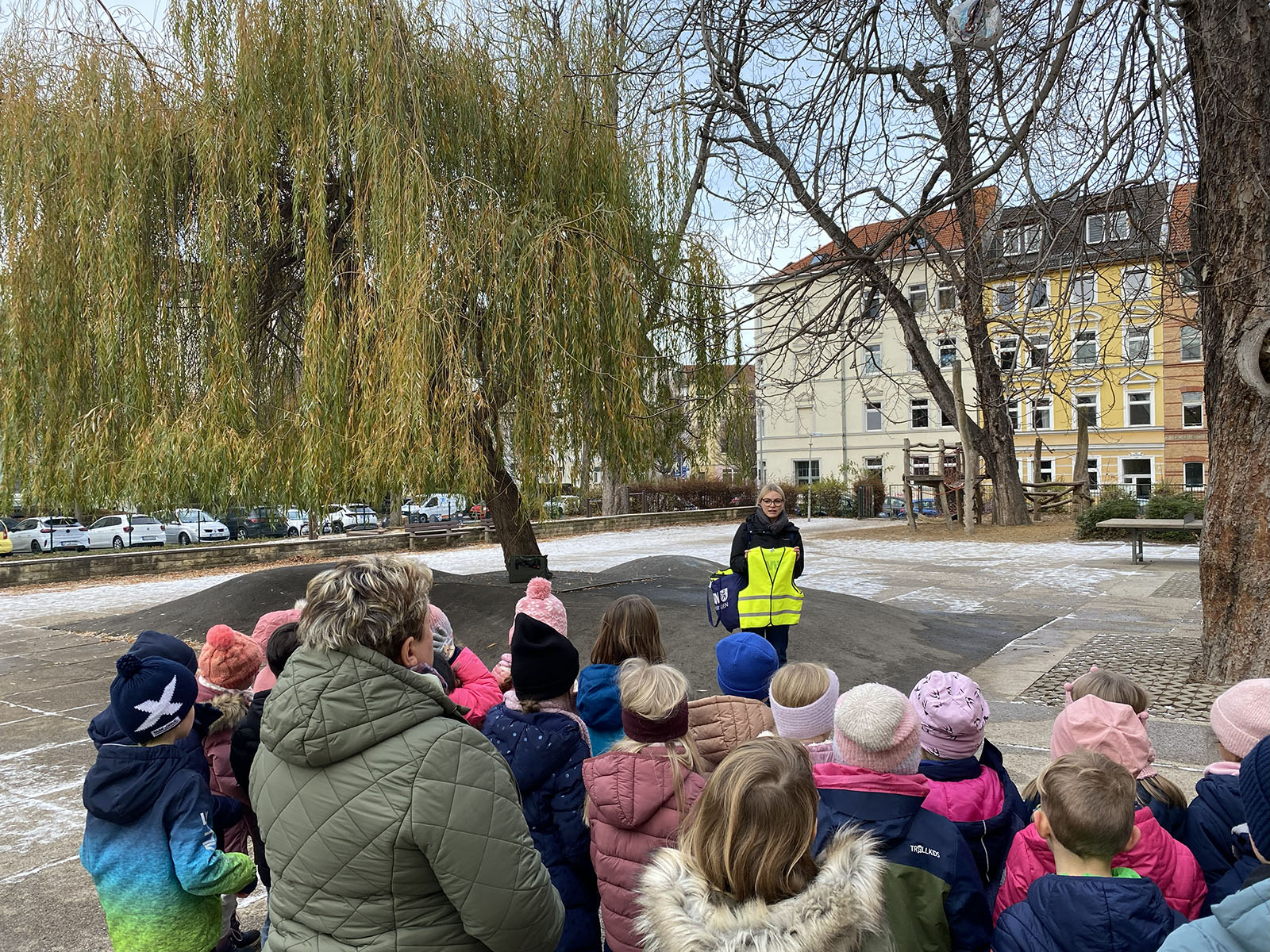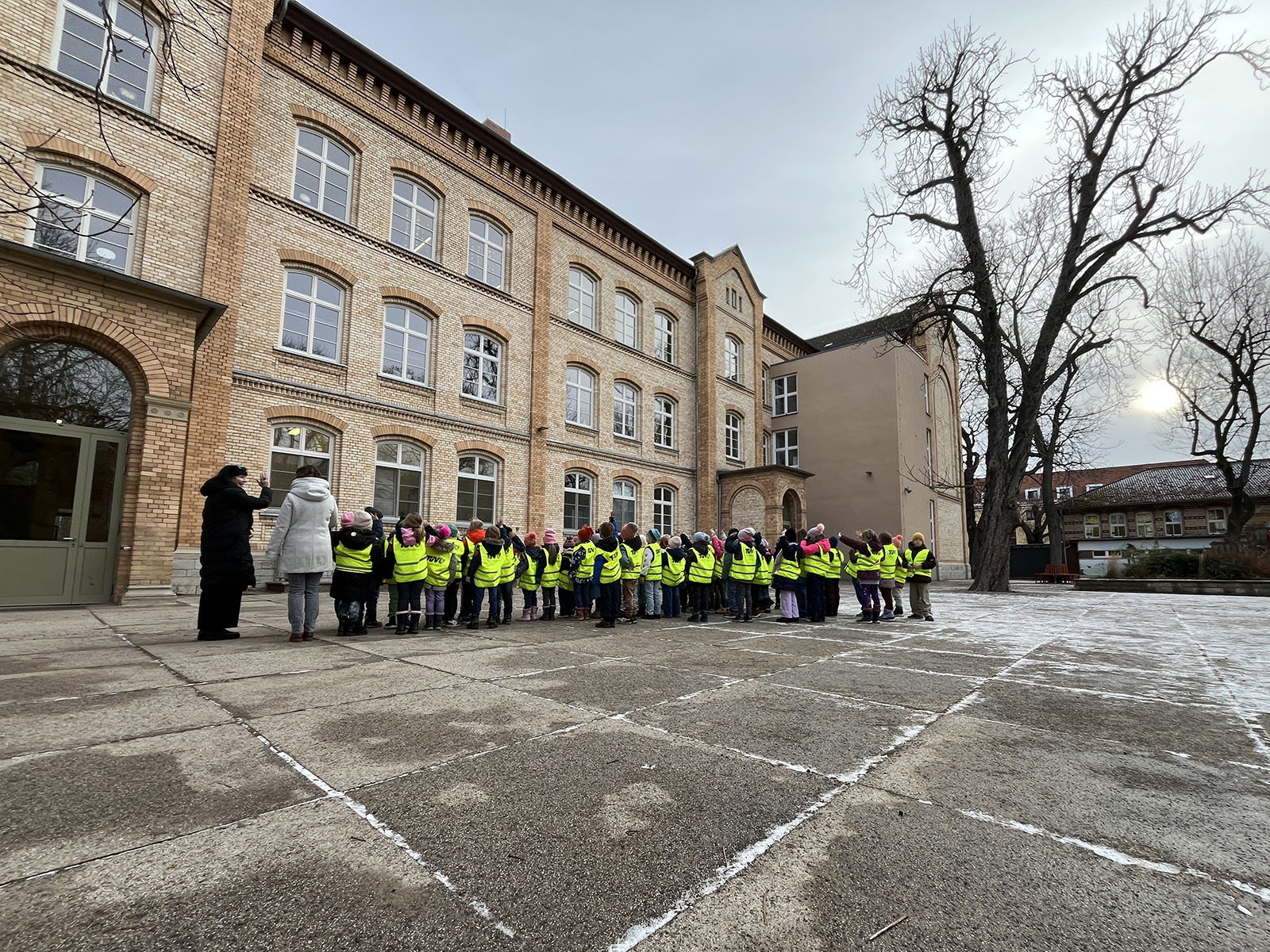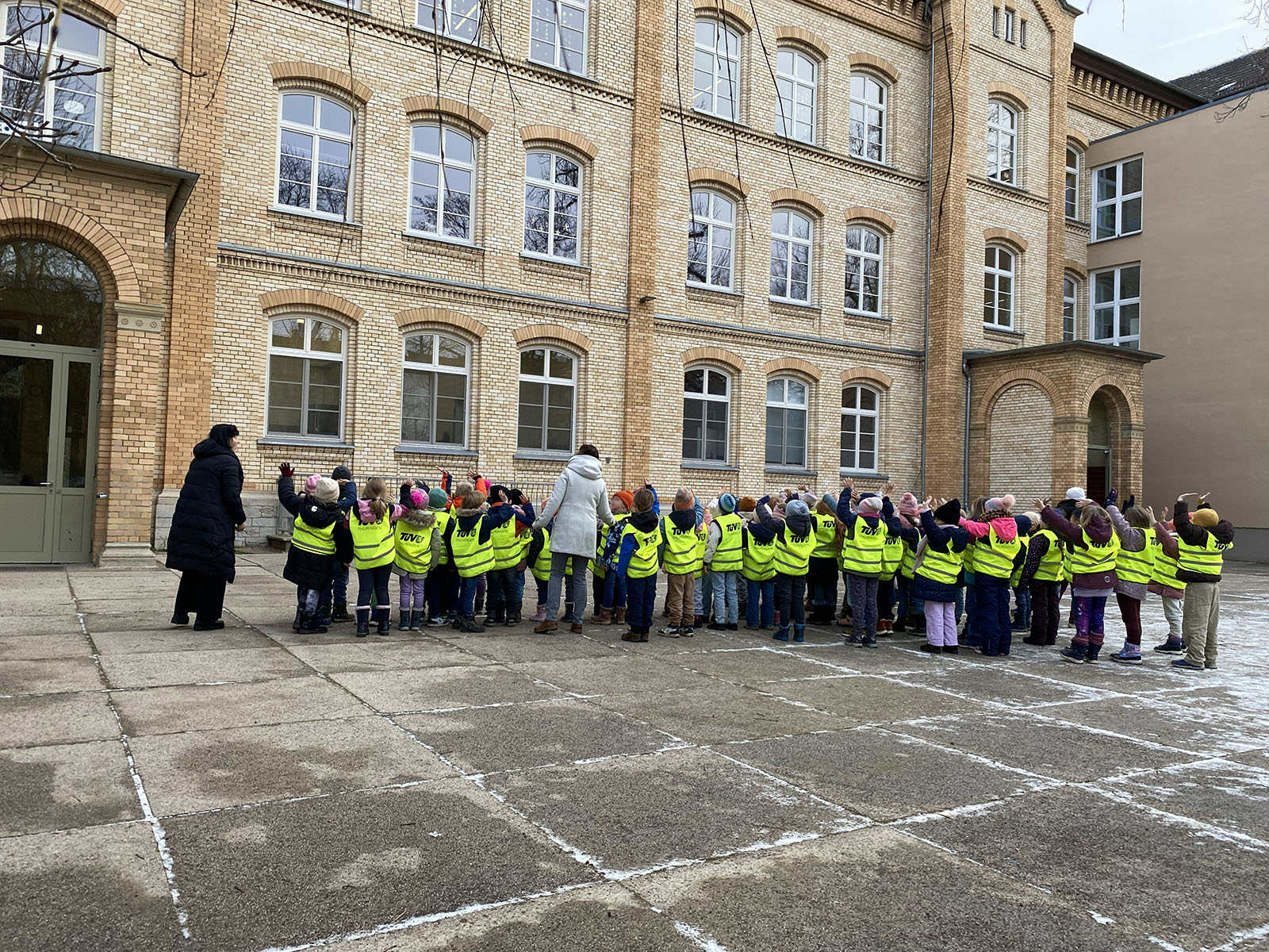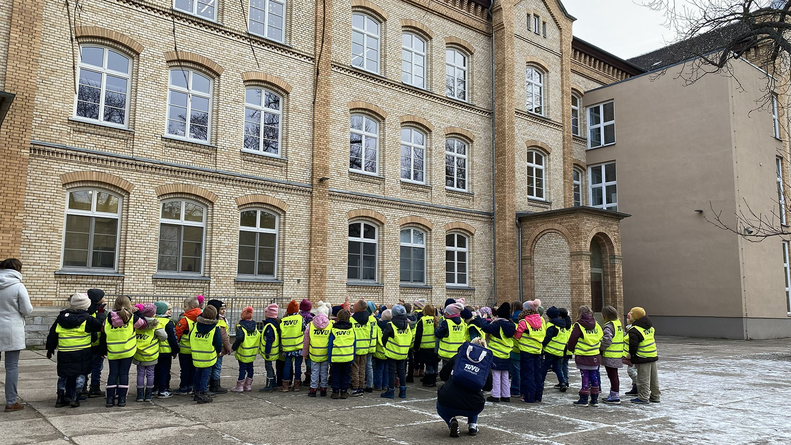 TÜV Thüringen stattet Erstklässler der Moritzschule Erfurt mit Warnwesten aus